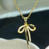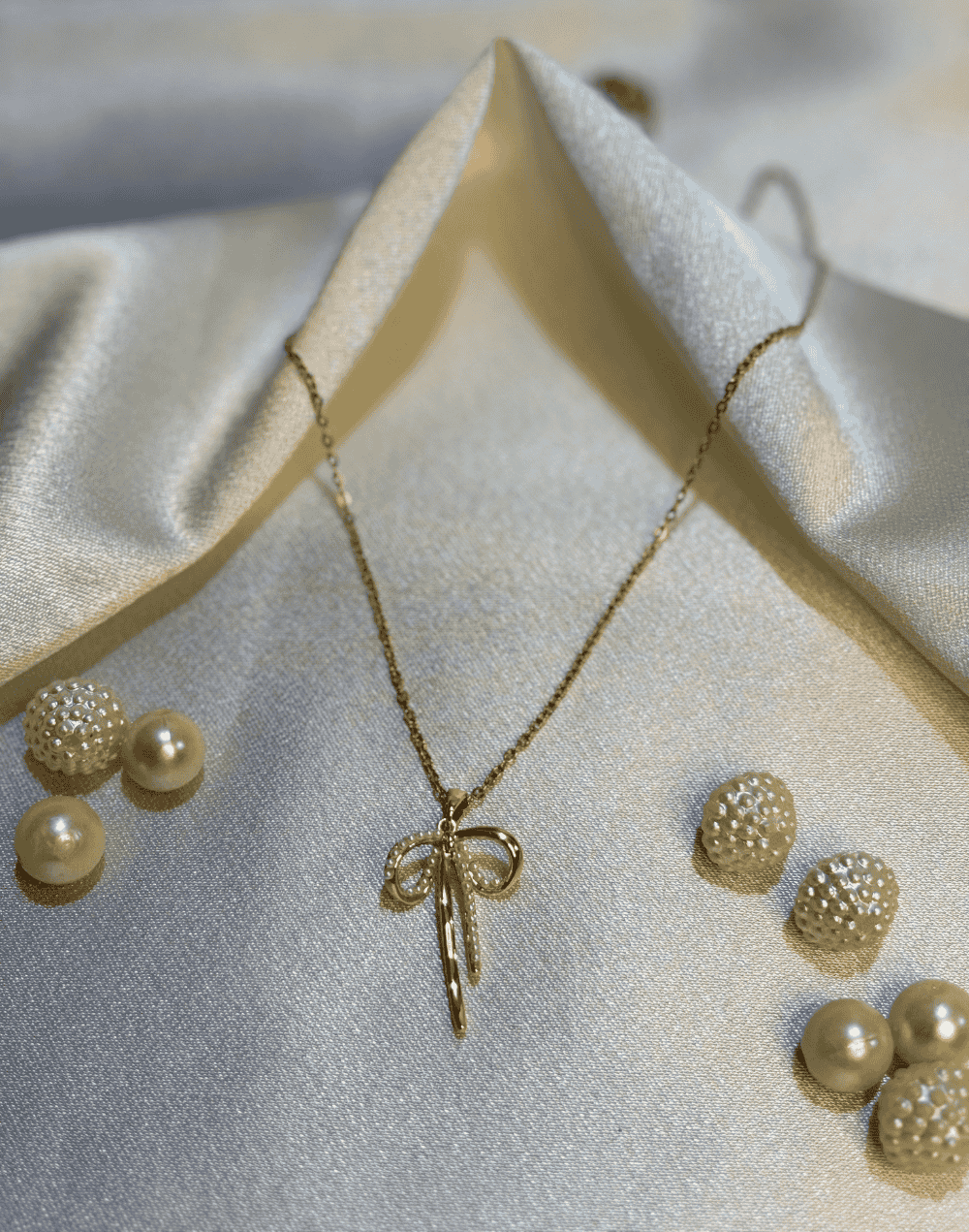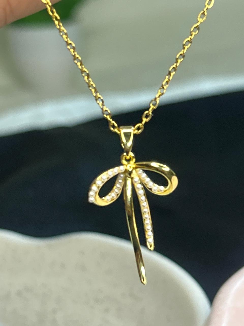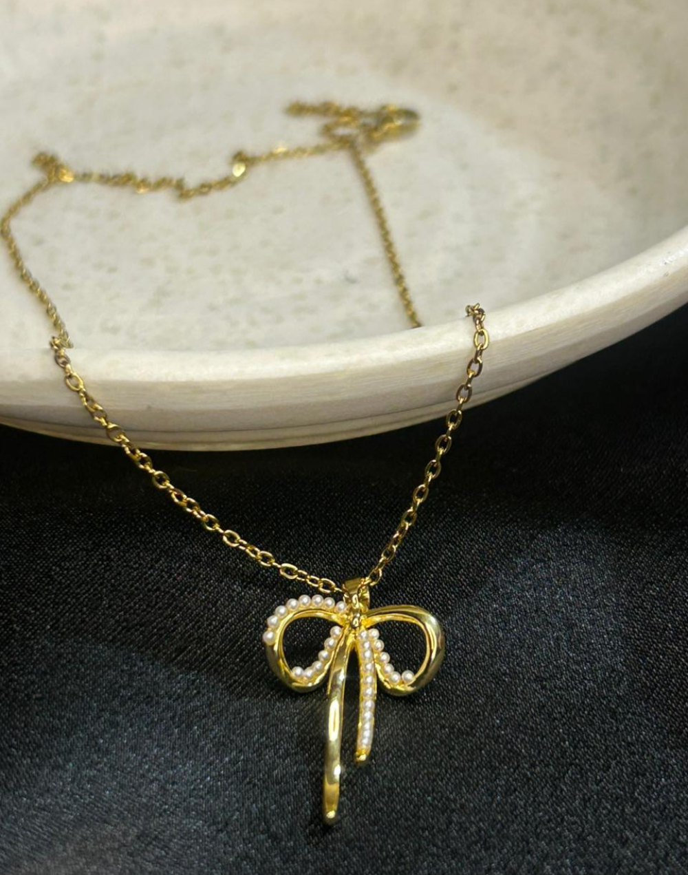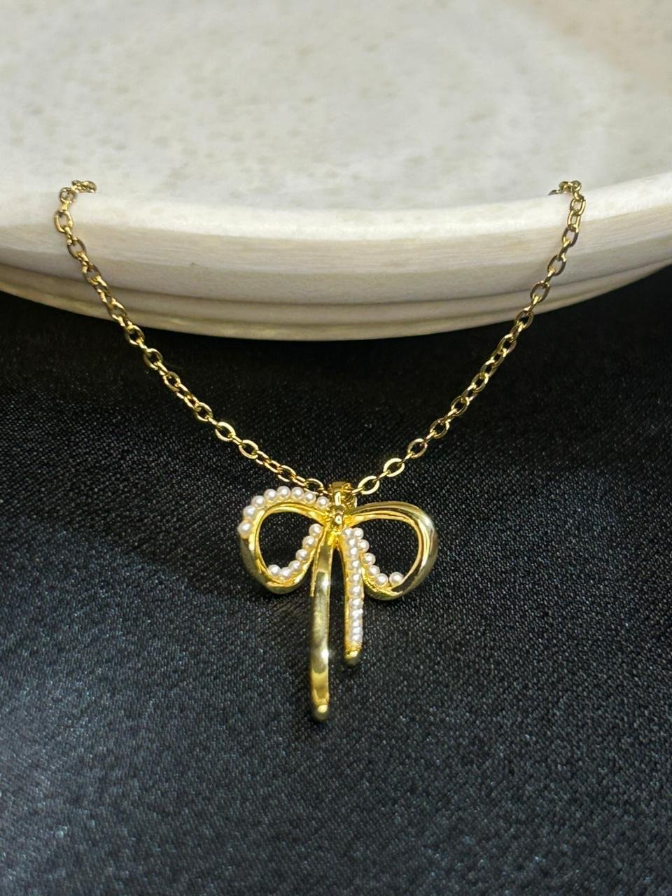 Bring a graceful touch to any outfit with the Cute Bow with Pearl 18K Gold Plated Anti-Tarnish Necklace. This enchanting piece showcases a finely detailed bow pendant, beautifully highlighted by a string of petite pearls along one ribbon, all plated in luxurious 18K gold for a brilliant, enduring shine. Designed with anti-tarnish technology, this necklace resists fading and keeps its luminous elegance season after season. The lightweight chain ensures comfort, while the playful, feminine design makes it perfect for both daily wear and special occasions. A wonderful gift or keepsake, this necklace celebrates sophistication, sweetness, and timeless charm.